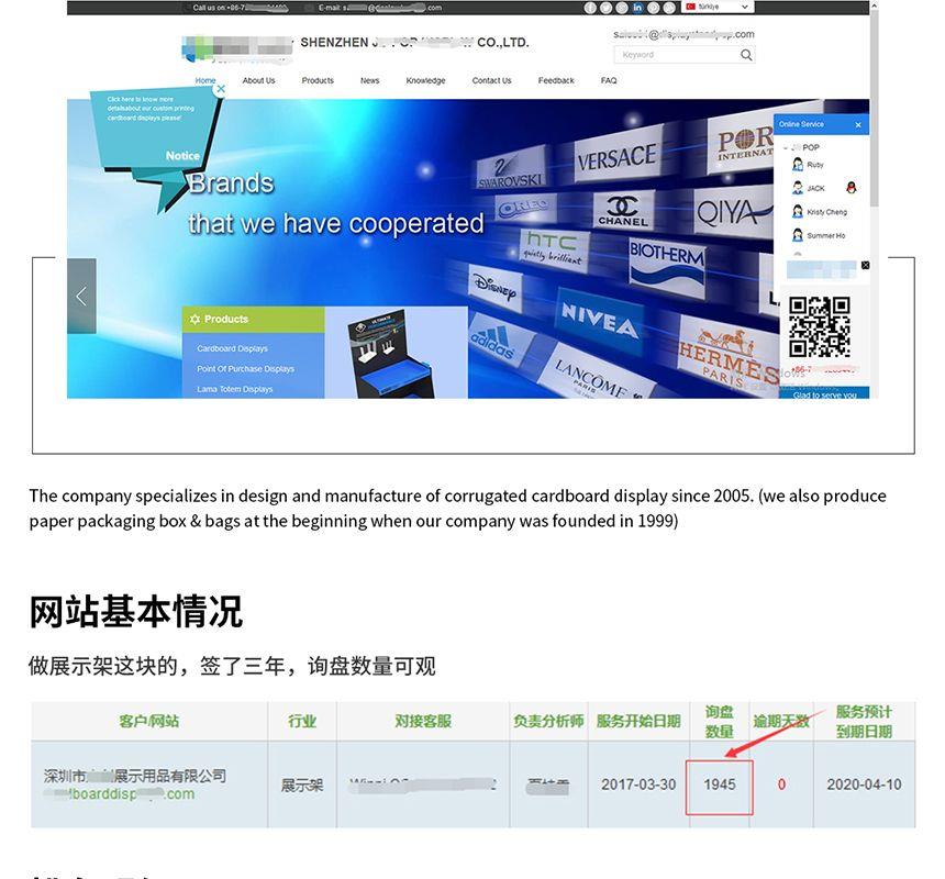 該公司是一家專業設計和制作各類紙貨架,紙貨架、紙展示架、獨立牌、包裝彩盒、促銷彩盒、促銷堆頭等POP展示用品公司,產品直銷國內和歐洲、北美、東南亞等地區。終端展示類紙制品以其環保低耗、成本價廉、絢麗多姿、裝運輕便,使用方便,促銷效果顯著等優點在國外發達地區已發展為主要的終端展示用制品,國內市場中該類制品業正逐步被各大中型日用品,冷飲和服裝品牌企業股份使用!一次性簽約外貿快車3年服務,共計拓展了4000多個產品相關關鍵詞,目前已有1600多個關鍵詞排名在谷歌首頁,這些關鍵詞每天可為該網站帶來200多個流量,客戶共計收到近2000個詢盤。