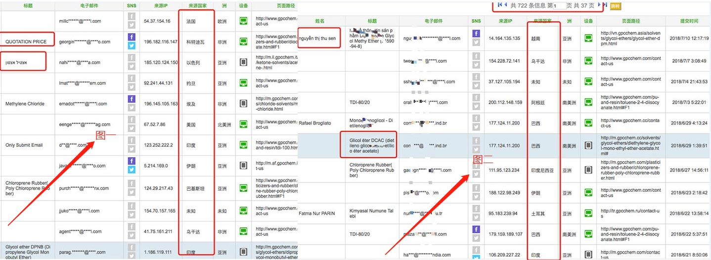 圖一中很多采購商習(xí)慣用母語訪問并發(fā)送詢盤;圖二總詢盤722個(gè),很多非英語國家?guī)淼牧髁哭D(zhuǎn)化的詢盤;