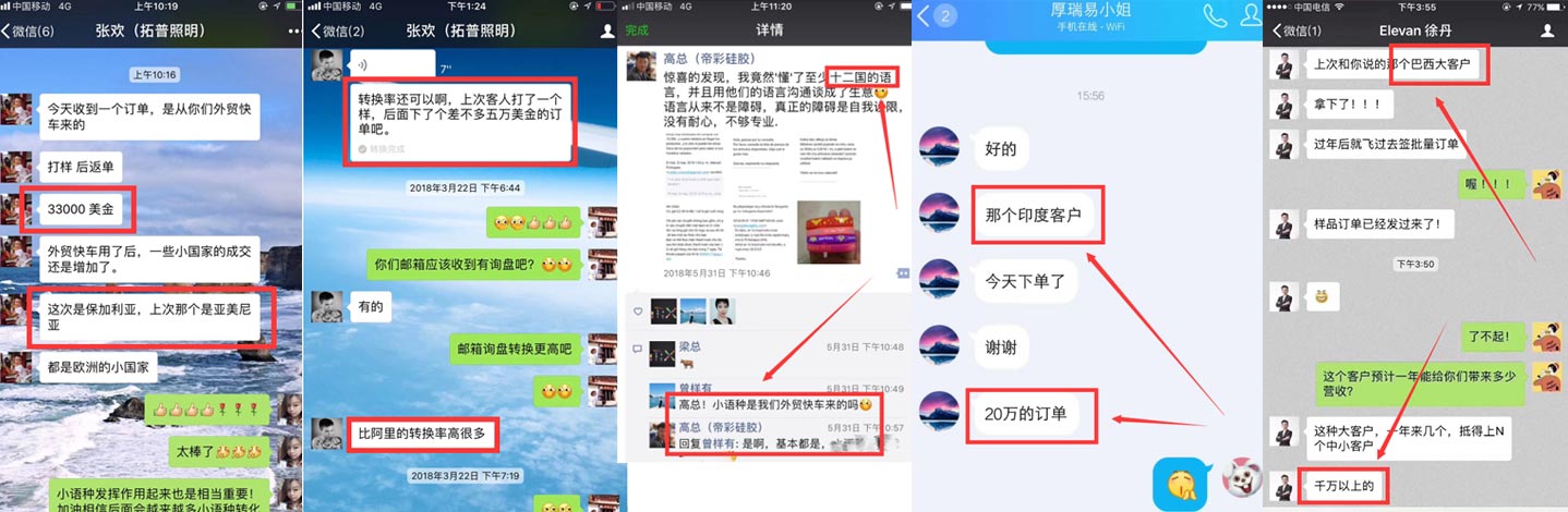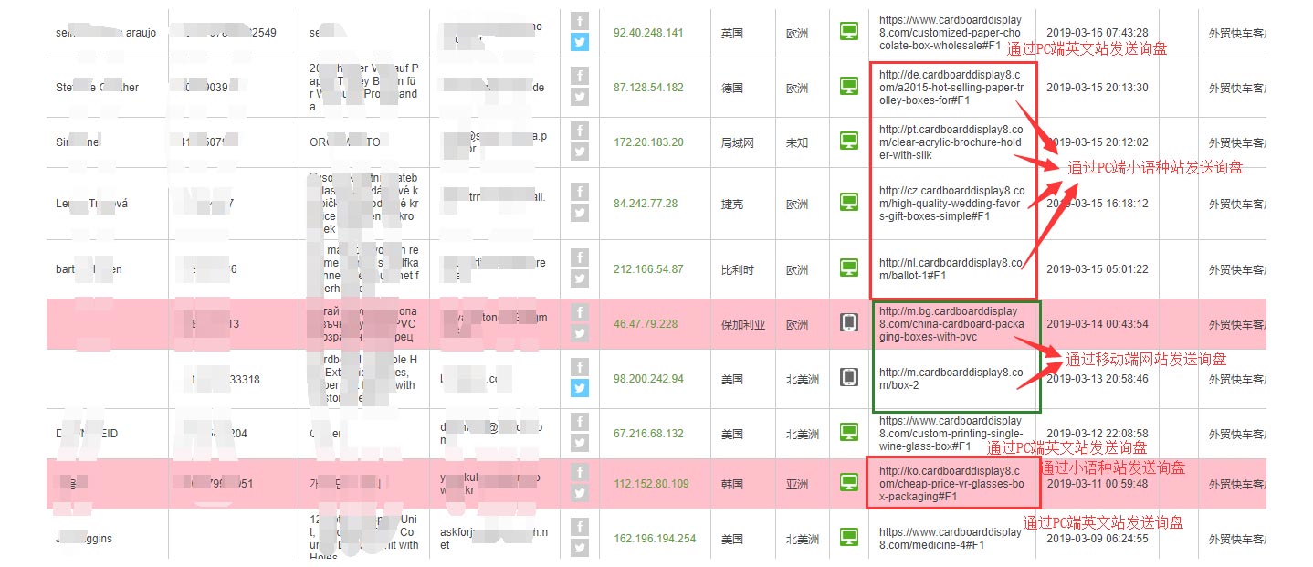 以下截圖為該客戶的部分詢盤,發(fā)現(xiàn)采購商通過小語種網(wǎng)站發(fā)送詢盤的占50%,采購商通過移動(dòng)端站發(fā)送詢盤占20%,通過英文主站發(fā)送詢盤占30%,意味著,如果只做英文站的推廣,你將會(huì)損失掉70%的潛在客戶!