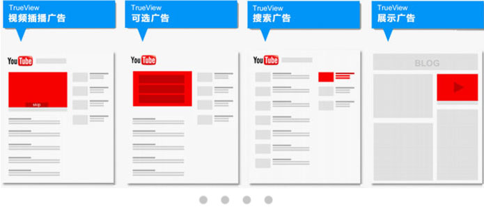 TrueView插屏廣告(In-stream Ads),號召性用語重疊式廣告,TrueView展示廣告 (Discovey Ads),導視廣告(Bumper Ads)和Youtube搜索廣告(Youtube Search)。